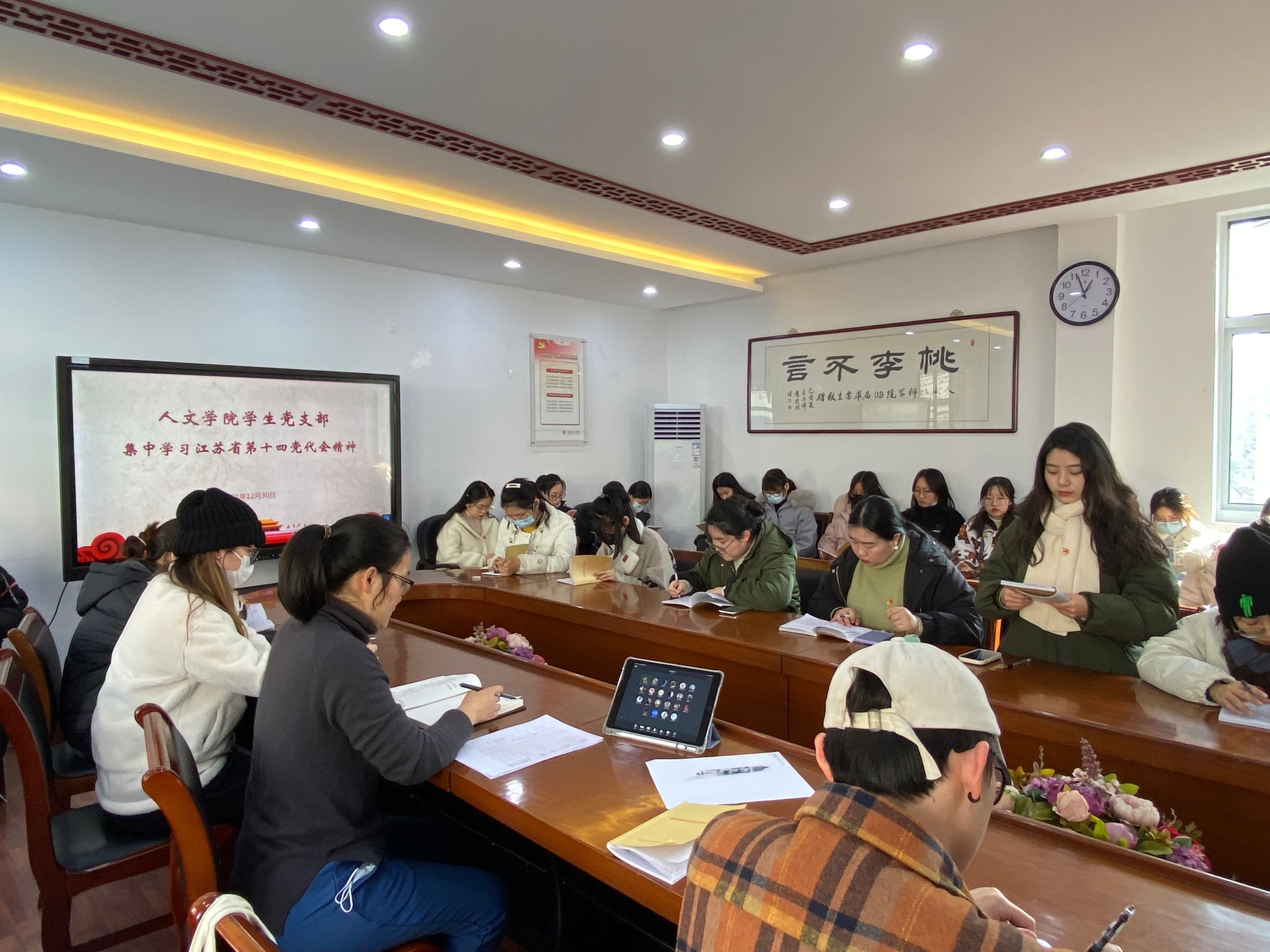 为认真学习贯彻落实江苏省第十四次党代会精神,深刻领会大会丰富内涵和精神实质、准确把握大会明确的目标要求和任务举措,12月30日中午,人文学院学生党支部于19号楼222会议室集中学习江苏省第十四次党代会精神。全体党员参加会议,会议由党支部书记欧阳秀主持。