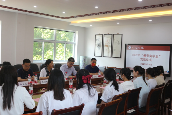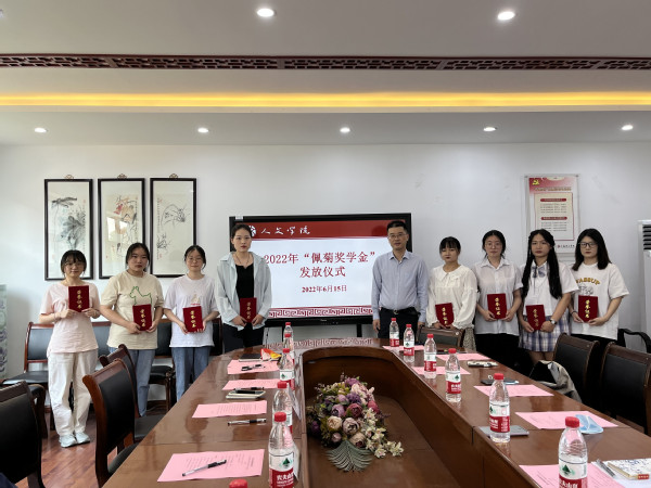 6月15日下午,我院在人文楼222会议室举行2022年“佩菊奖学金”发放仪式。校党委副书记周兰珍,校教育发展基金会、校友办、学生工作处相关负责人,文旅学院党政领导及部分师生代表等参加仪式。李佩菊老师的家属宋锷先生应邀出席会议。