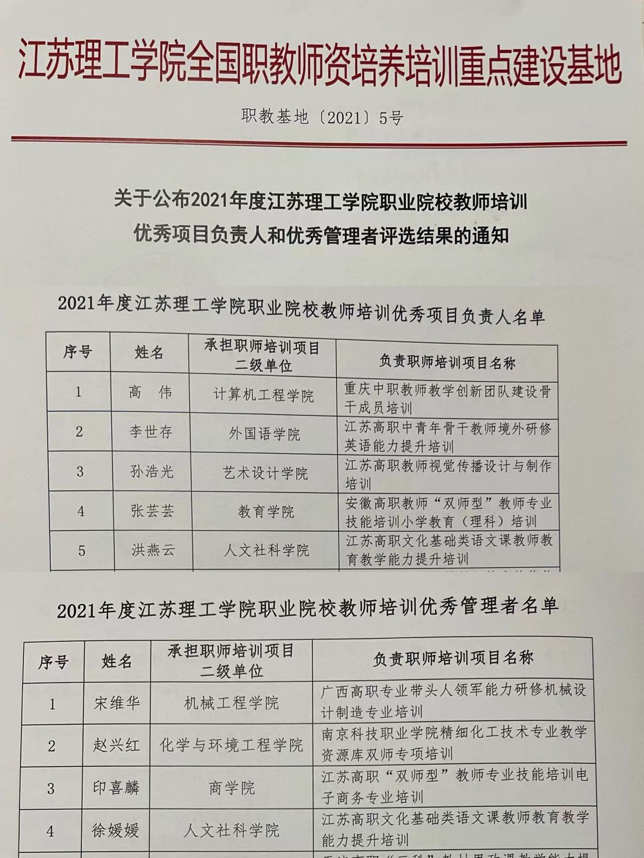 会上,陈胜权宣读了《关于公布2021年度江苏理工学院职业院校教师培训优秀项目负责人和优秀管理者评选结果的通知》。我院洪燕云教授、综合办公室主任徐媛媛分别获评2021年度江苏理工学院职业院校教师培训优秀项目负责人和优秀管理者,她们所负责职教师资培训项目为“江苏高职文化基础类语文课教师教育教学能力提升培训”。
