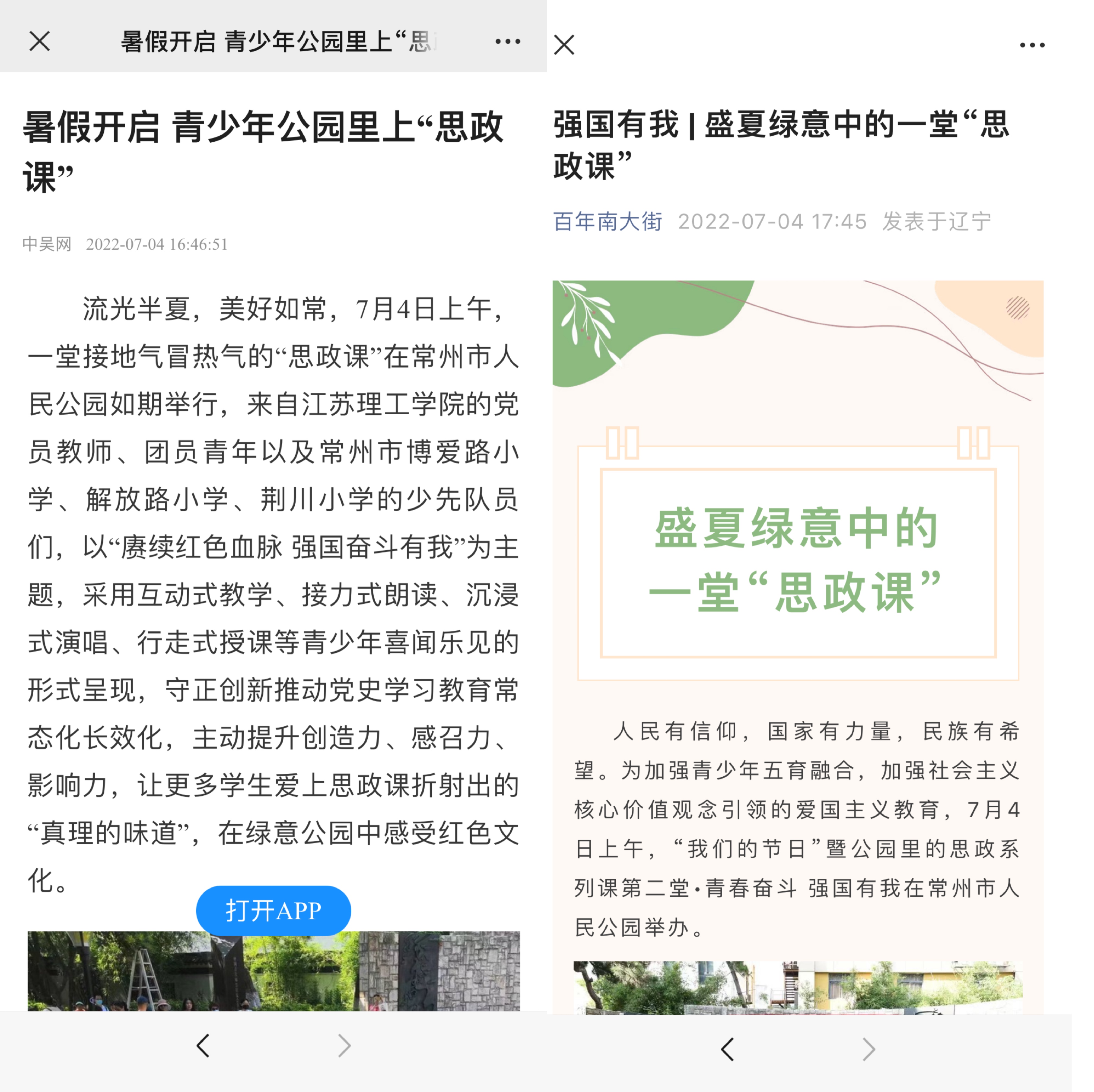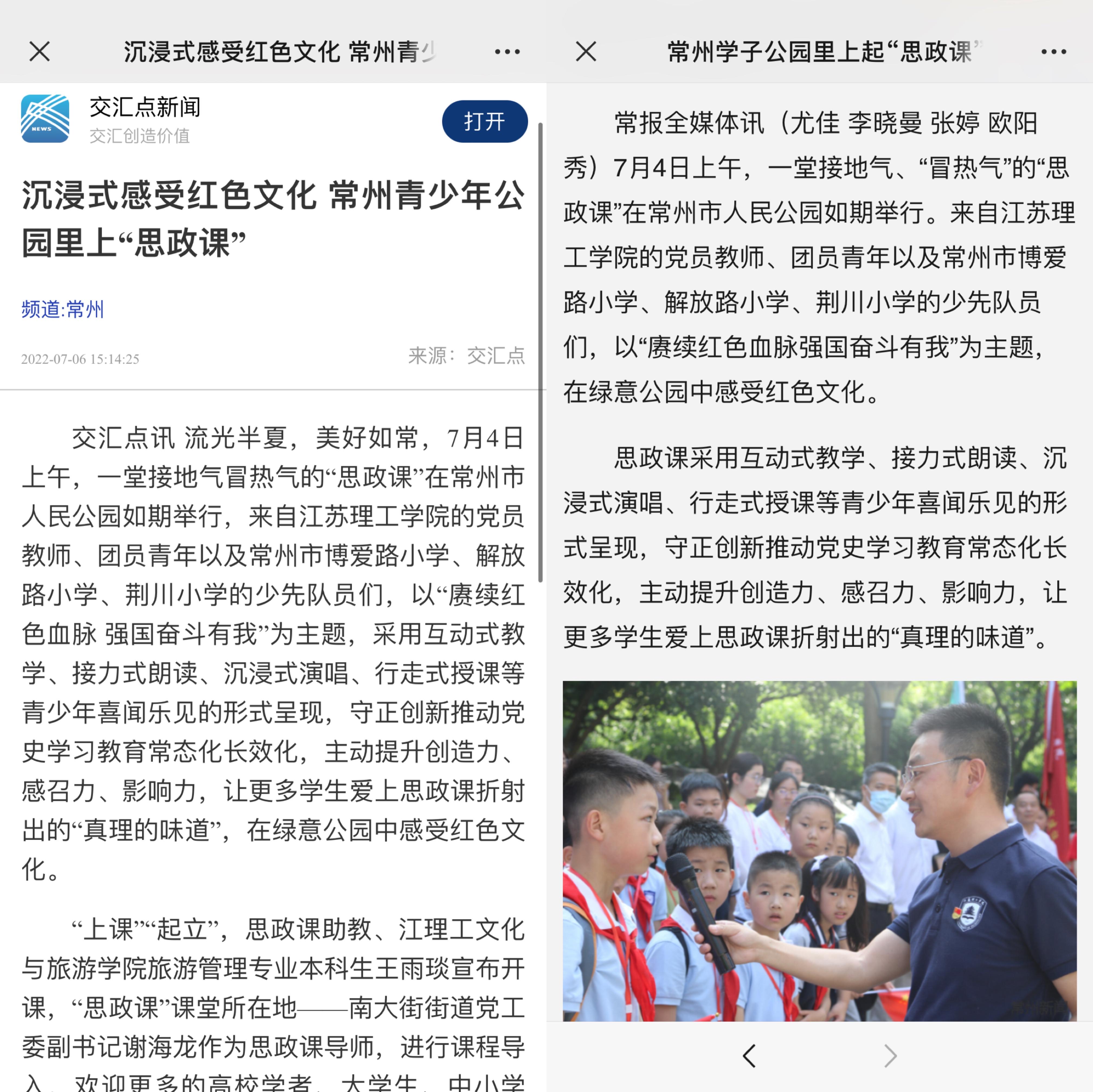 近日,中吴网、常州新闻、交汇点新闻、百年南大街等多家媒体报道我院青少年公园里上“思政课”活动。流光半夏,美好如常,7月4日上午,一堂接地气冒热气的“思政课”在常州市人民公园如期举行,来自江苏理工学院文化与旅游学院的党员教师、团员青年以及常州市博爱路小学、解放路小学、荆川小学的少先队员们,以“赓续红色血脉 强国奋斗有我”为主题,采用互动式教学、接力式朗读、沉浸式演唱、行走式授课等青少年喜闻乐见的形式呈现,守正创新推动党史学习教育常态化长效化,主动提升创造力、感召力、影响力,让更多学生爱上思政课折射出的“真理的味道”,在绿意公园中感受红色文化。(通讯员:李晓曼、张婷、欧阳秀)