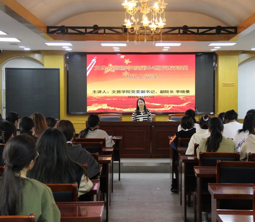 为进一步提高入党积极分子政治素质和理论水平,把好党员发展的入口关,11月11日下午,文旅学院学生党支部在19号楼404会议室举行第64期分党校入党积极分子培训暨“书记上党课”专题活动。文旅学院党委副书记、副院长李晓曼出席活动并担任主讲人,会议由学生党支部书记顾静雯主持,53名入党积极分子参加培训活动。