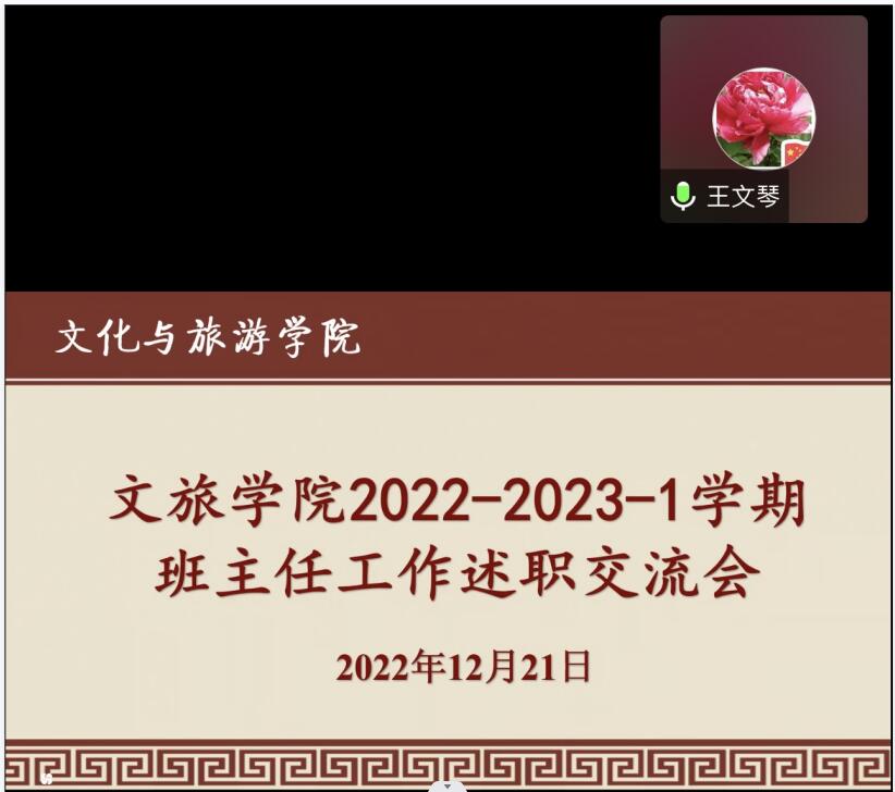 12月21日,文化与旅游学院线上召开2022-2023-1学期班主任工作述职交流会,学院党委副书记李晓曼、副院长常如瑜出席本次会议,大会由学工办主任卞舒云主持。