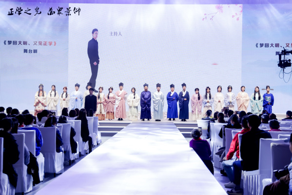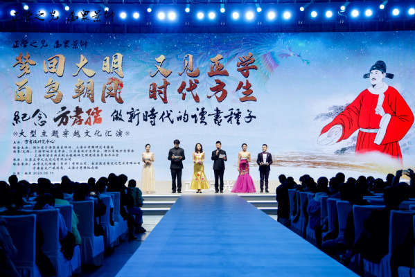 文旅学院师生张羽程、杜一飞、王潇涵等共同主持了“梦回大明 又见正学 百鸟朝凤 时代方生”大型主题文化汇演。文旅学院团委选送了大合唱《正学颂》和大型历史舞台剧《梦回大明又见正学》。66人组成的大合唱《正学颂》规模盛大、声音洪亮、铿锵有力,充分展示出了方孝孺“刚正不阿 以身殉国”的铮铮铁骨。舞台剧《梦回大明 又见正学》再现了方孝孺、方孝孺的老师宋濂、方孝孺的小儿子方中宪以及方孝孺在石镜精舍求学的情景,故事情节跌宕起伏,情节感人,仿佛置身场景,受到了主办方和现场与会人员的好评。