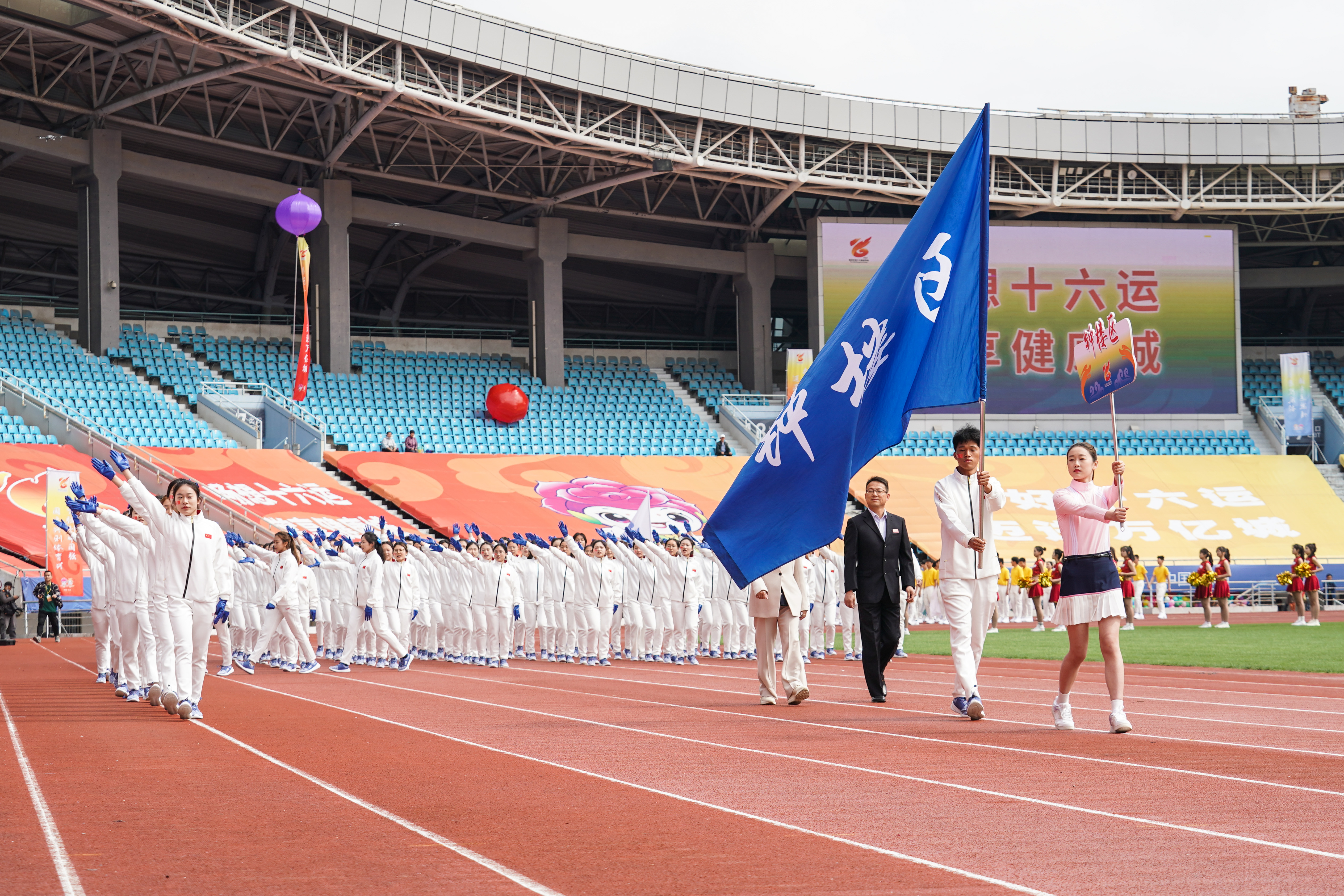 5月7日,常州市第十六届运动会在常州奥体中心体育场开幕。上午9时,伴随着雄壮激昂的入场进行曲,国旗、市运会会旗、红旗、彩球方阵,以及来自溧阳市、金坛区、武进区、新北区、天宁区、钟楼区、常州经开区和青少年部、高校部、中技部、职工部、农村部、老年人部、社会部的14支代表团陆续入场,全面展示常州市各地、各部门、各行业昂扬向上的精神面貌和飒爽英姿。由文化与旅游学院学子组成的百人方阵,代表钟楼文体旅局亮相开幕式。