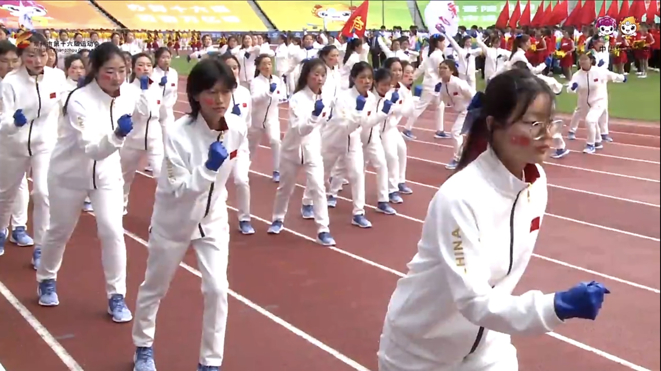 主席台前,青年学子以最饱满的精神高呼出“幸福钟楼、勇争一流”的口号,呐喊清脆嘹亮。入场式的方阵表演是以流动的队形变化和手部动作的形式展开,队形和动作展现了“更高、更快、更强、更团结”的体育精神,体现出钟楼人攻坚克难、勠力争先的风貌。钟楼青年摆出奔跑的姿势,寓意钟楼区奋力抢占文体旅高质量发展“制高点”;或摆出“运”字队形,寓意钟楼区的运河五号创意街区、古运河南大街文化旅游区等5个项目入选江苏“运河百景”标志性运河文旅产品。方阵集体佩戴的蓝色手套巧妙地融合了钟楼运河元素,通过流动的队形变化,尽情描绘出灵动的钟楼形象,也寓意着钟楼区正积极推动常州文体旅发展开创新局、走在前列的笃定信心。