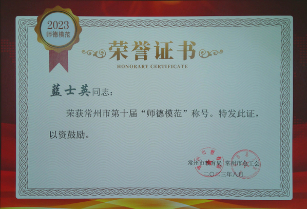 2023年8月,常州市教育局、常州市总工会公布了常州市第十届师德标兵和师德模范名单,江苏理工学院文化与旅游学院教授蓝士英荣获常州市师德模范称号。