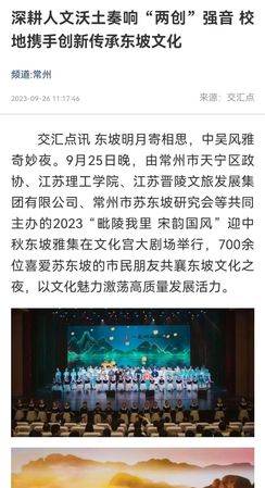 中秋佳节前夕,恰逢学校第三次党代会胜利召开之际,由天宁区政协、江苏理工学院、江苏晋陵文旅发展集团有限公司、市苏东坡研究会等共同主办,天宁区教育局、工人文化宫、天宁街道办事处、天宁城建、中粮.人瑞科技等共同承办的2023“毗陵我里 宋韵国风”迎中秋东坡雅集在文化宫大剧场成功举行。新华日报交汇点、常州日报、常州广播电视台、常州晚报、中吴网等多家媒体,常州政协、天宁政协、江苏理工学院官方微信公众号等平台给予关注,在常州市民中产生热烈反响,进一步提升了文化与旅游学院的知名度、美誉度和影响力,详见报道: