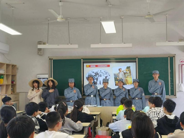 活动中,宣讲团成员演绎了情景短剧《朱德的扁担》。同学们通过观看表演,深刻感受到朱德同志与战士们同甘共苦的革命情怀。剧中“藏扁担”的幽默情节让现场笑声阵阵,而战士们团结互助的感人场景也让同学们深受触动。