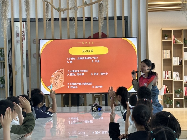 在青枫公园的讲堂内,“文小青”志愿者团队为学生们带来了一场融合传统与现代的沉浸式课堂。“文小青”单鑫宁以《月令七十二候集解》中“物致于此小得盈满”的记载为切入点,详细解读了小满节气的自然特征与农事意义。她提到,小满时节北方麦类籽粒开始灌浆,南方则进入雨季,江河渐满,民间谚语“小满不满,干断田坎”便生动反映了这一时节雨水对农业的重要性。互动环节中,单鑫宁通过趣味问答引导参与者思考节气与生活的联系。例如,当问及“小满为何被称为‘满’”时,孩子们踊跃回答:“因为麦子快熟了!”“因为雨水变多了!”现场气氛热烈,不少家长表示,这种寓教于乐的方式让孩子对节气有了更直观的认识。