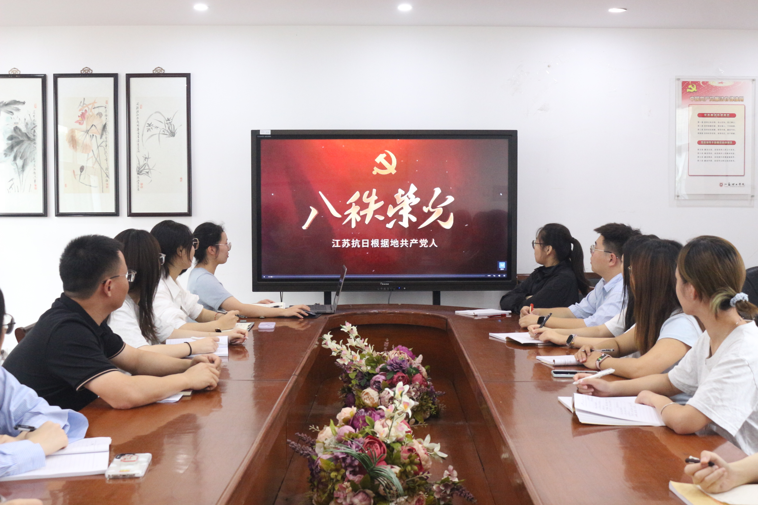 杨婷婷从“铭记历史、重温阅兵、传承精神、砥砺前行”四个部分层层展开。“铭记历史:回溯抗战艰苦历程”,通过详实的历史资料和生动的案例,带领党员重回烽火连天的抗战岁月,深刻阐述了中国人民抗日战争的极端艰苦性和复杂性,强调要永远铭记那段悲壮的历史,珍惜来之不易的和平。“重温阅兵:感受大国崛起力量”,通过短片回顾阅兵的高燃场面,学生党员纷纷提到“最美战旗、最燃战歌、DF-5C、车牌号1945和2025等关键词”,回忆起那些心潮澎湃的瞬间。集中学习习近平总书记在纪念中国人民抗日战争暨世界反法西斯战争胜利80周年大会上的讲话。“传承精神:弘扬伟大抗战精神”是本次党课的核心部分。杨婷婷围绕“中国共产党为何是全民族抗战中流砥柱”这一关键问题,引导全体党员进行交流研讨,深刻领会中国共产党在抗战中“越是艰险越是向前”的使命担当,号召全体党员要自觉成为伟大抗战精神的忠实传承者和坚定实践者。“砥砺前行:勇担民族复兴重任”,结合当前时代背景与学生党员工作学习实际,勉励党员要将从抗战历史中汲取的精神养分转化为前进动力,坚定理想信念,锤炼过硬本领,将个人发展融入国家发展大局,勇担新时代赋予青年的历史重任,为实现中华民族的伟大复兴贡献青春力量。课后,全体党员共同观看《八秩荣光 ——江苏抗日根据地共产党人》党员教育系列视频。
