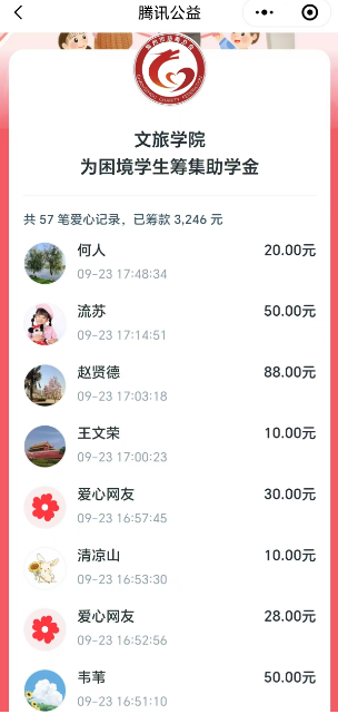 根据上级要求,由校工会牵头,9月17-9月23日,文化与旅游学院教职工积极开展“2025年‘慈善一日捐’活动”。学院干部教师发挥先锋模范作用,积极响应号召,用实际行动影响身边的人,带动更多的师生参与到慈善活动中来。截止到9月23日,学院教师共计捐款57笔,筹集3246元,为弘扬慈善精神,积极贡献文旅人的力量。