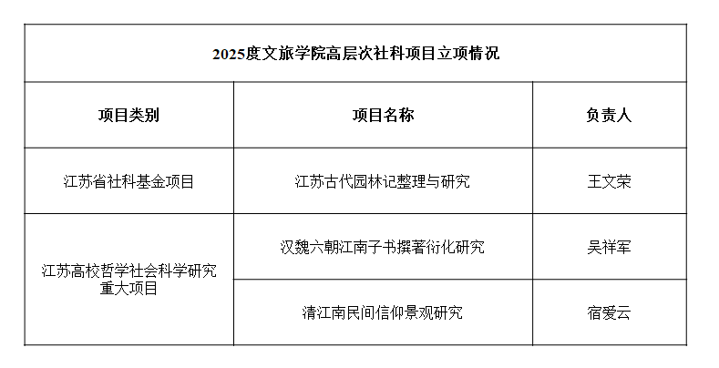 中文系教授王文荣博士《江苏古代园林记整理与研究》获批2025年江苏省社科基金项目立项,文秘系副教授吴祥军博士《汉魏六朝江南子书撰著衍化研究》、旅游管理系副教授宿爱云博士《清江南民间信仰景观研究》获批2025年江苏高校哲学社会科学研究重大项目立项。文旅学者近年来接连获批高层次科研项目,有助于推动学院学术研究向纵深发展,加强学科理论精细化、应用化。(图文/韦苇;审核/胡小海;编辑/韦苇)