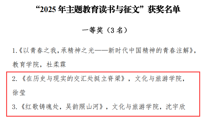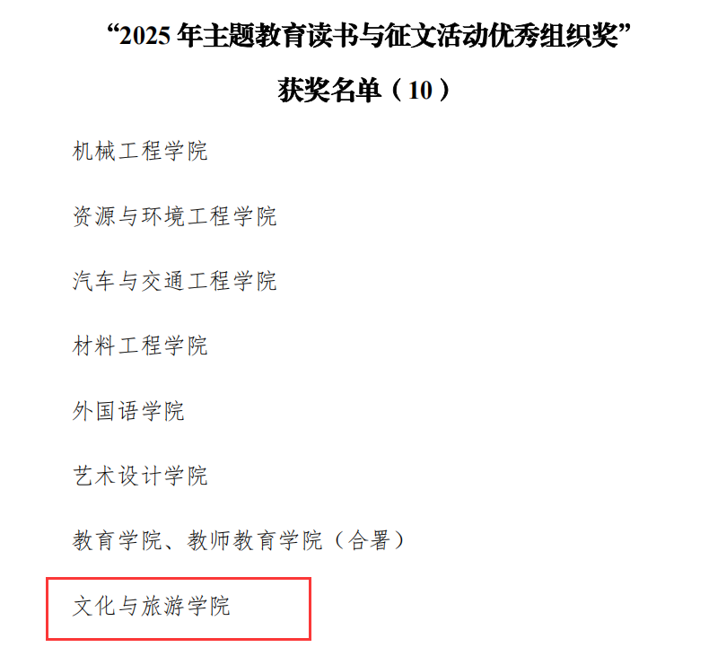 2025年9月,校关工委发布了《关于公布2025年主题教育读书及征文活动获奖名单的通知》,文化与旅游学院关工委组织报送的学生征文作品分别获校级一等奖二项、三等奖一项,学院荣获优秀组织奖。