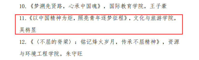 此次征文活动是2025年江苏省教育系统关工委组织开展的“爱学习 爱劳动 爱祖国——老少共筑中国梦”主题教育活动,要求组织广大青少年学生,开展《中国精神在我心》和《不屈的脊梁》主题教育读书、征文活动。活动开展以来,文旅学院关工委积极响应学校安排,发动学生广泛参与,收到学生征文作品近百篇。经学院评审,共推荐了5篇征文进入校级评选,最终在全校15个学院报送的20篇获奖征文中,我院有3篇作品获奖。