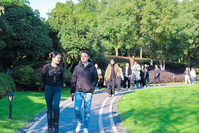 移动课程伊始,MTA研究生们在中吴宾馆国宾专员的带领和讲解下,走进中吴宾馆的天香园、玖园、东第园和主楼等,近距离参观了健身房、游泳馆、电影院、会客厅、客房、餐厅、大堂吧等宾馆内部设施以及园林景观,让学生们深刻感受到了中吴宾馆的成就不仅在于其园林之美,更在于其将现代管理理念与传统文化智慧相融合的创新实践