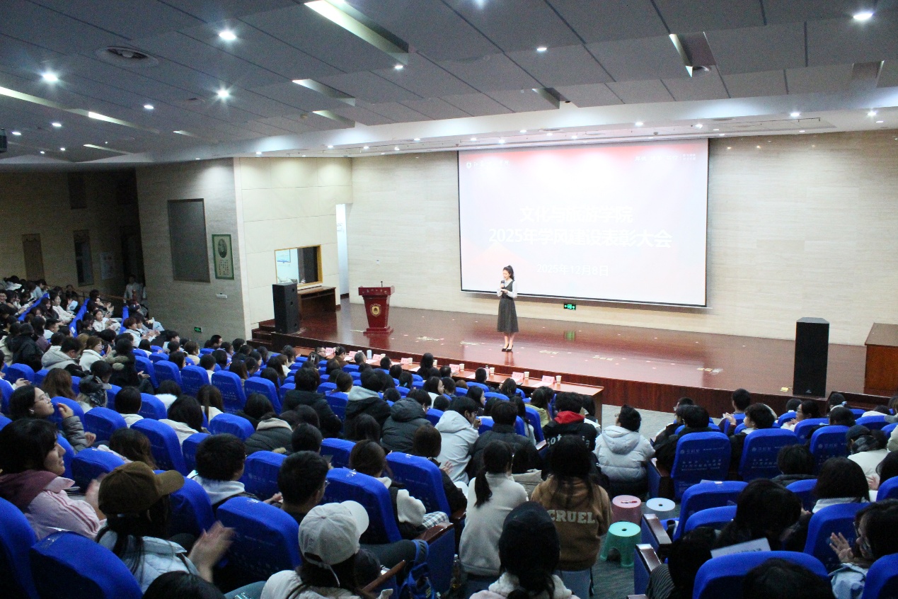 为全面总结年度学风建设成果,凝聚师生共建优良学风的强大合力,助力学院教育教学质量稳步提升,12月8日,文化与旅游学院2025年度学风建设表彰大会在图书馆北报告厅顺利召开。大会集中表彰了本年度在学风建设工作中成效显著、表现优异的先进集体与个人。学院党委书记张羽程、院长演克武、党委副书记兼副院长郑秋娟、中文系主任才峻、酒店管理系主任干霖、旅游管理系主任叶帅、全体辅导员及2025级全体学生出席本次大会。